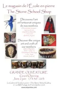 4. Stone School Shop The Stone School Shop will open its doors on June 1st 2023. This year, we have more than 35 artists and artisans offering a wide variety of arts and crafts. Opening hours are Thursday to Sunday from 11 to 4 (closed on June 24th) until the end of August, followed by Saturdays and Sundays in September. We may stay open in October if there is sufficient interest on the part of participants in our plein air sessions to host a show of their work completed over the summer. We have space for a few more participants. If you are interested or have questions, please email Linda Roy at galerie@old.artpontiac.com.