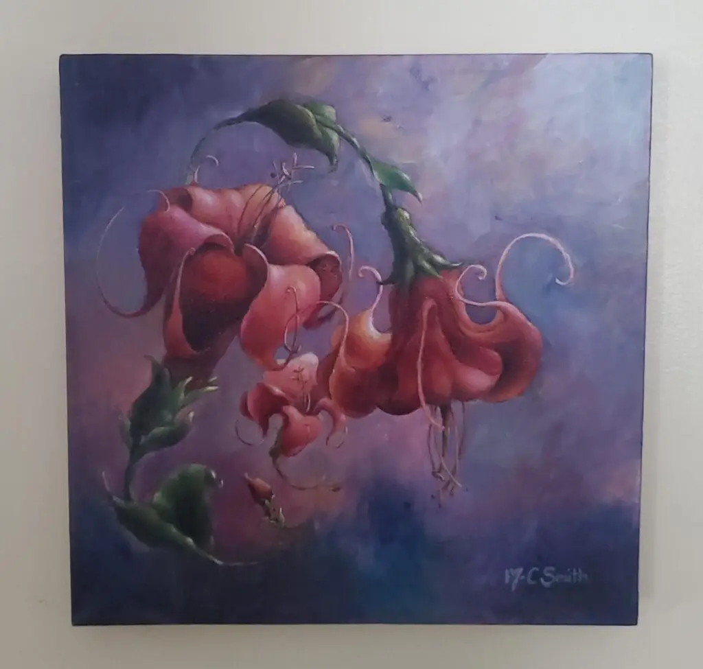 In this evocative acrylic painting “The Weight of Tendernes”, Marie-Catherine Smith presents two blossoms bowing toward one another, their forms heavy with bloom. Suspended against a soft, atmospheric background of blended violets and muted blues, the flowers seem to hover in a dreamlike stillness. Their curved stems and delicate tendrils create a quiet conversation between them — one leaning, the other responding — as though tenderness itself carries weight.