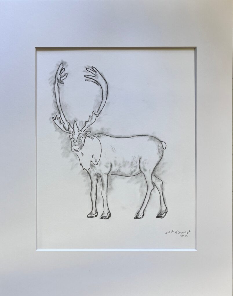 Igloopialik uses restrained charcoal lines and soft shading to suggest the animal’s form without heavy detail. The sweeping curves of the antlers dominate the composition, drawing the viewer’s eye upward and emphasizing the caribou’s impressive stature. The simplicity of the lines allows the essence of the animal to emerge naturally, highlighting its grace and balance.