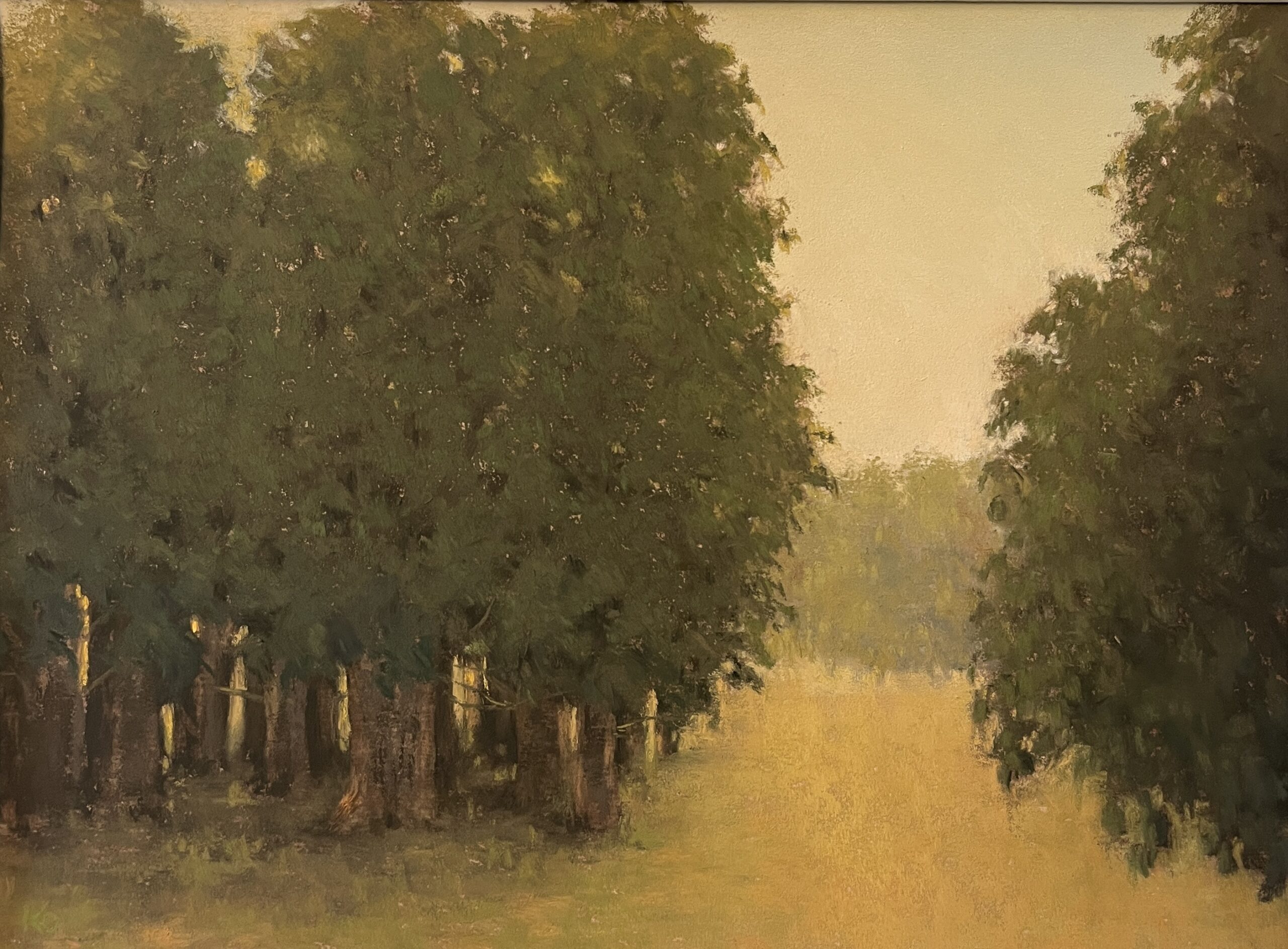 This pastel was inspired by a late-winter view from my kitchen window, where a sliver of morning sunlight broke through the trees after many overcast days. That emerging light sparked excitement and grew into a much brighter expression in the final artwork.