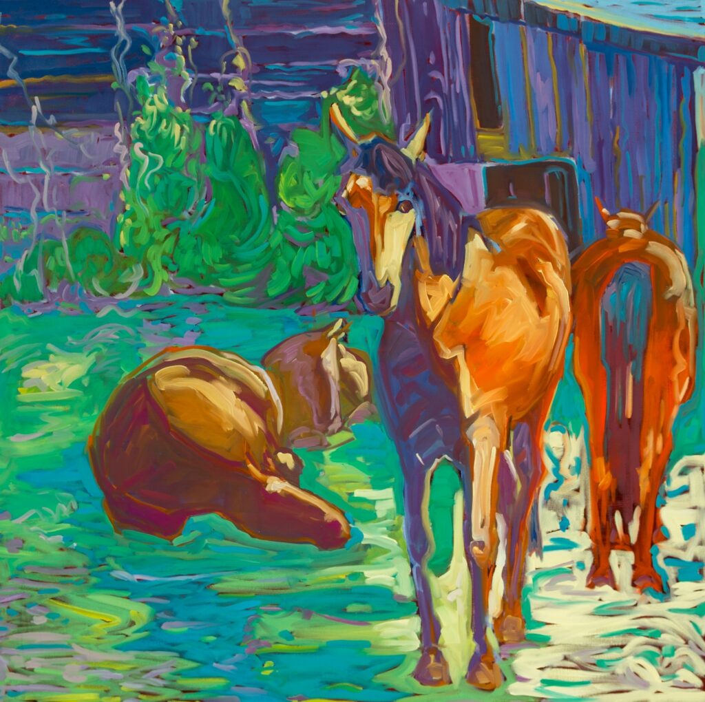 Savinainen’s brushwork is bold and expressive. Vibrant strokes of turquoise, emerald, violet, and flame-orange energize the canvas, transforming a simple pastoral setting into something luminous and alive. The standing horse, bathed in warm golden tones, seems almost illuminated from within, while the resting companion embodies trust and ease. The interplay of saturated colour and gestural movement suggests not just morning light, but emotional warmth — a greeting between beings who share space and quiet understanding.