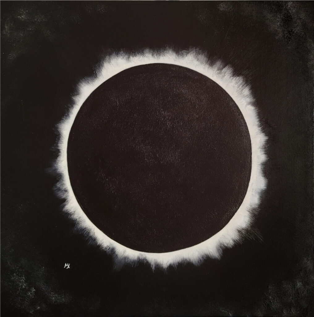 The white aura that surrounds the circle feels like a quiet ignition, as though light is emerging from shadow. It recalls an eclipse, a cosmic threshold, a moment suspended between presence and absence. The textured black background absorbs the gaze, encouraging contemplation. In this restrained palette, love becomes something elemental — not ornate, not embellished — but vast, enduring, and infinite.