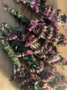 The creation of smoke bundles involves assembling and tying together dried aromatic plants (such as sage, lavender, rosemary, bay leaves, etc.) to form small bouquets used to purify the air or create an atmosphere that encourages calm and introspection.