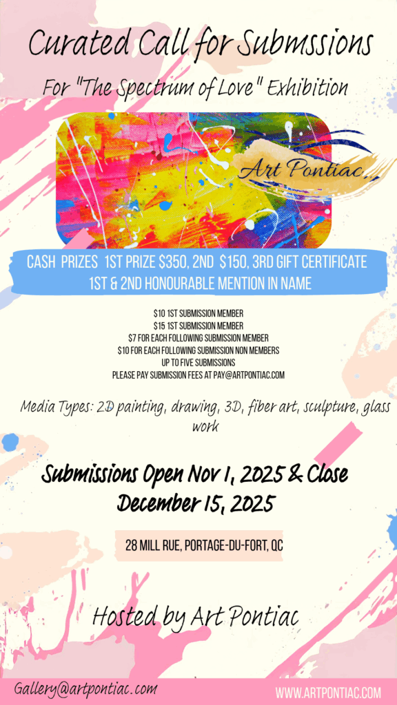 - Artwork Drop-off: January 23, 24,25, 30 and 31 Feb. 6,7 and 8th, 11a.m. to 4p.m. ( If you have a requested date or time other than what is listed, please let us know by emailing gallery@artpontiac.com