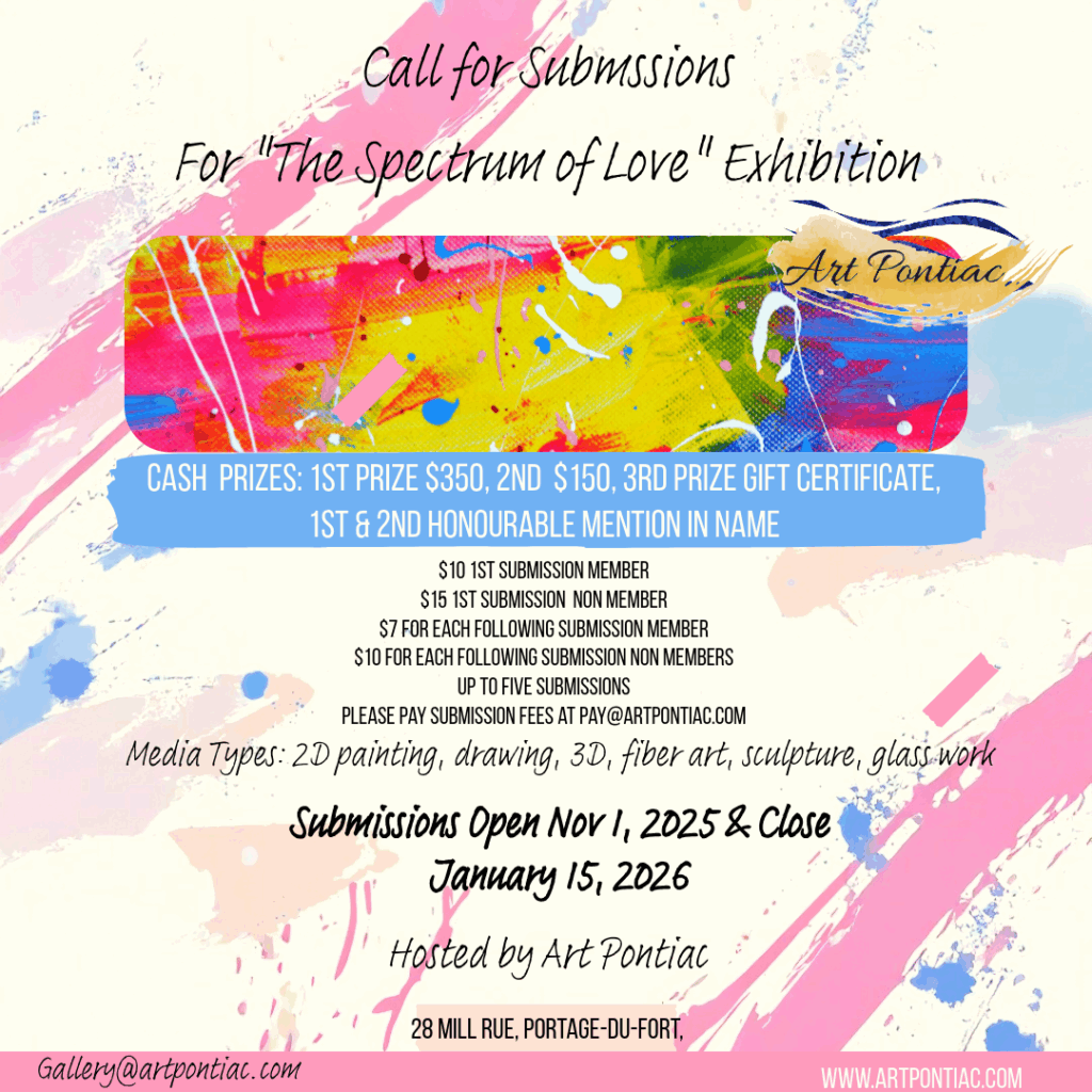 Artwork Drop-off: January 30,31 Feb. 1, 6,7 and 8th, 11a.m. to 4p.m. ( If you have a requested date or time other than what is listed, please let us know by emailing gallery@artpontiac.com