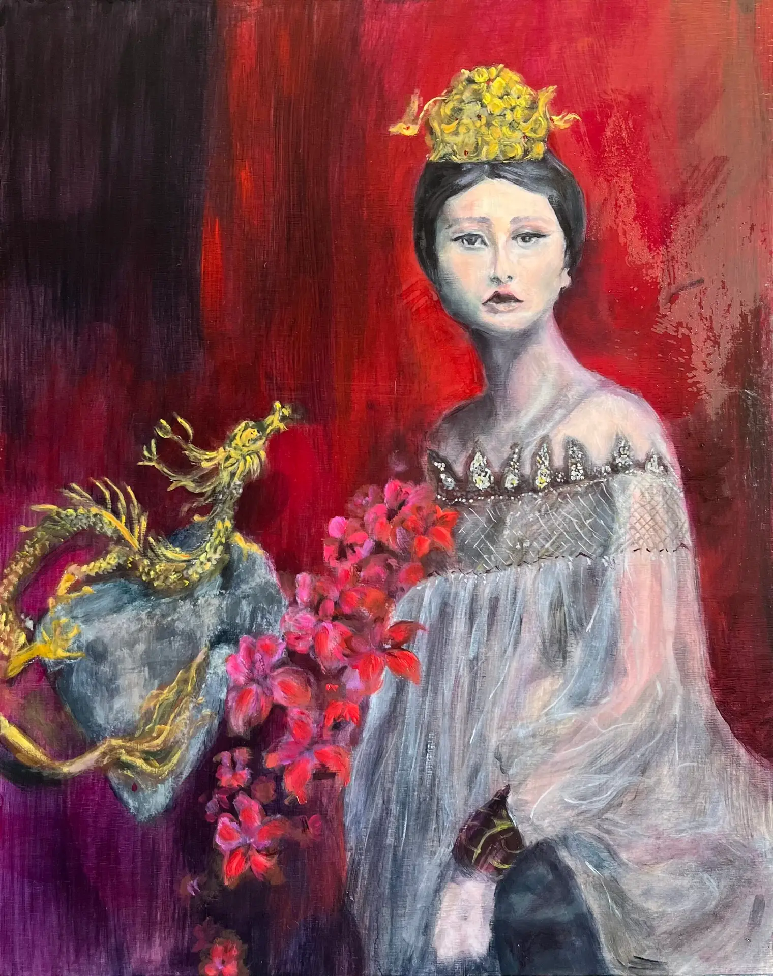 Peinte sur bois, dont le grain naturel affleure sous l’huile et l’acrylique, l’œuvre est ancrée dans une matière vivante qui enrichit sa symbolique mythique. Le jeu entre les surfaces mates et lumineuses permet à la lumière de capter des éclats inattendus — dans les écailles du dragon, dans l’or de la couronne, dans les plis du tissu — renforçant les thèmes de transformation et de rayonnement intérieur.
