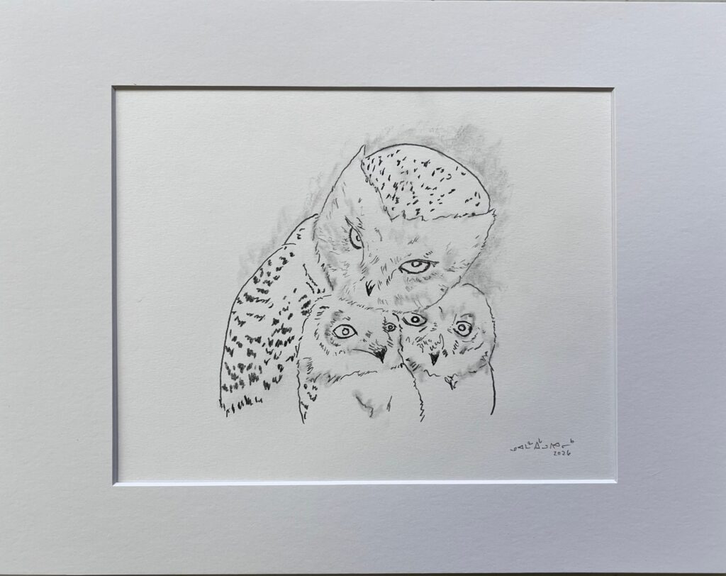 Réalisé avec un travail de ligne délicat et des ombrages subtils, le dessin démontre la capacité remarquable d’Igloopialik à transmettre l’émotion et la personnalité avec très peu de traits. Les textures douces des plumes et le regard expressif des oiseaux donnent vie à l’image et rappellent le calme du paysage arctique où de telles scènes se produisent.
