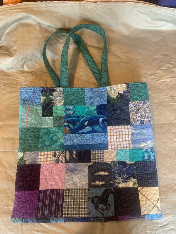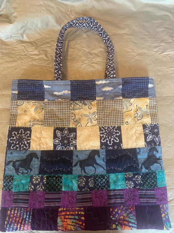 Linda has been playing around with small scraps of material – some donated by fellow member Katharine Fletcher – and has come up with a new bag model.