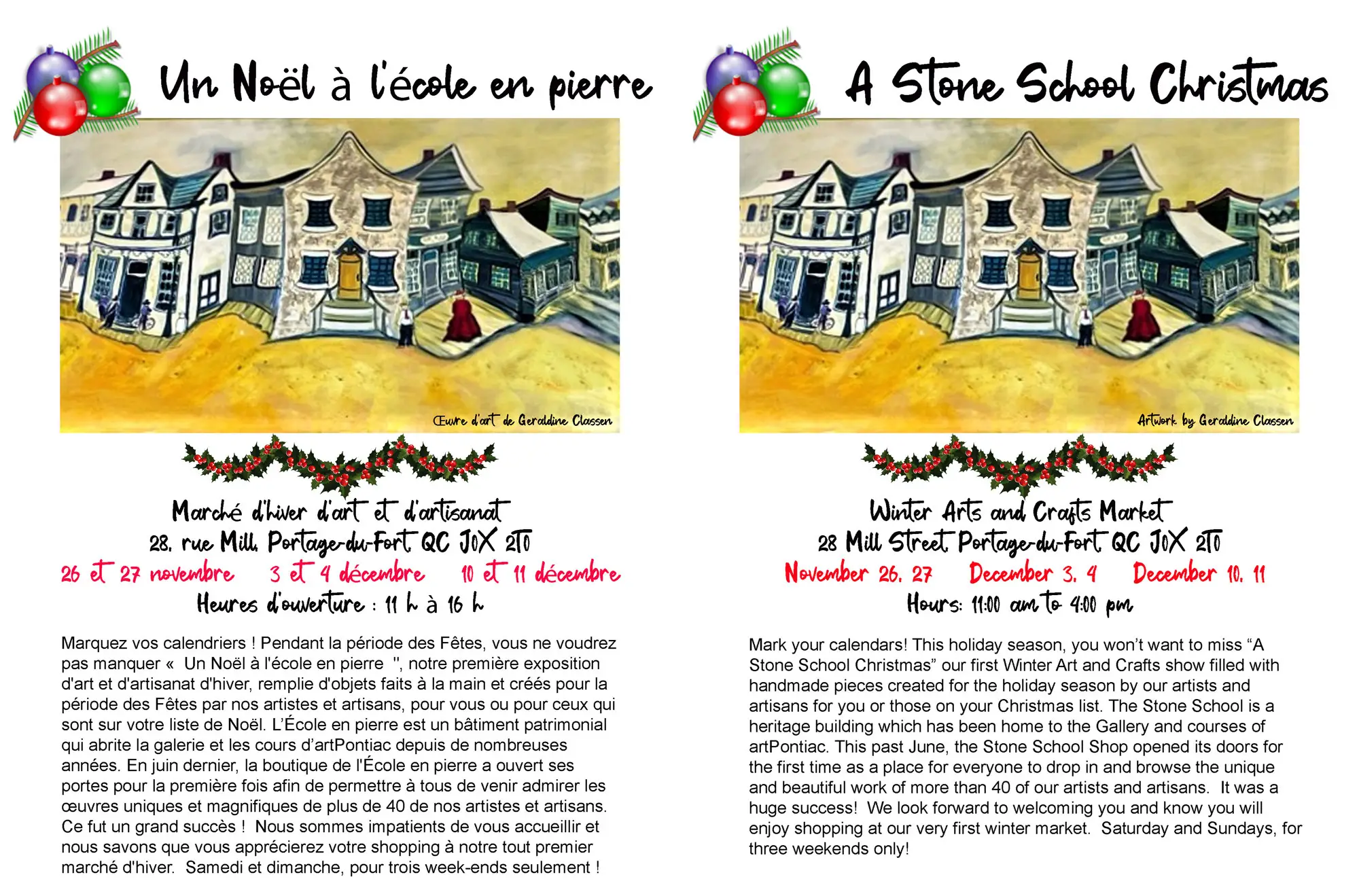 Enfin, mais c’est tellement important, nous désirons vous inviter à assister à notre AGA le DIMANCHE 4 DÉC. à l’École en pierre, située au 28 rue Mill à Portage du Fort. Puisqu’il s’agit du deuxième dimanche du marché d’art dans la boutique, venez tôt et jetez un coup d’œil. Des rafraîchissements seront offerts à partir de 14 heures et la réunion commencera à 16 heures, à la fermeture de la boutique.